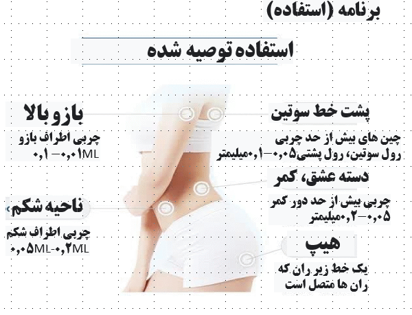 - چربی اطراف بازو: 0.01 ~ 0.05 میلی لیتر یا کمتر چربی دور شکم/کمر (لایه چربی ضخیم تر): 0.05 میلی لیتر تا 0.2 میلی لیتر یا کمتر چربی دور باسن: 0.05 میلی لیتر تا 0.15 میلی لیتر یا کمتر